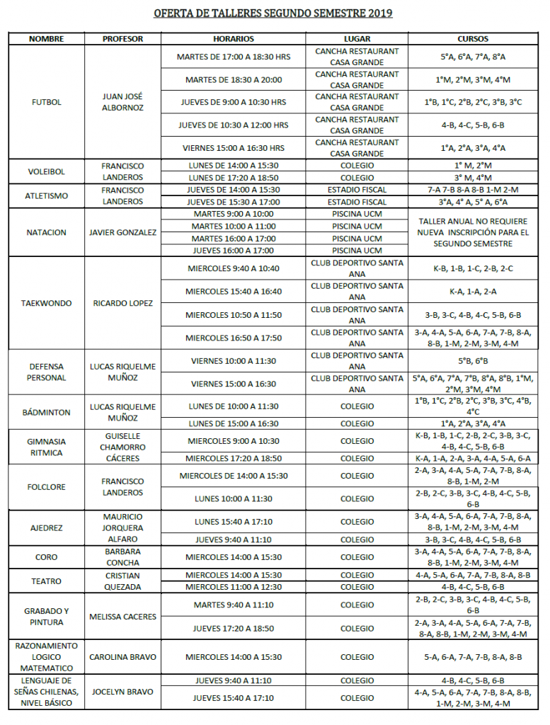 La inscripción se efectuará desde el 31 de Julio al 4 de agosto 2019. Posterior a este periodo debe realizarla en recepción del colegio con la Sra. Lorena, siempre y cuando exista cupo en el taller escogido.